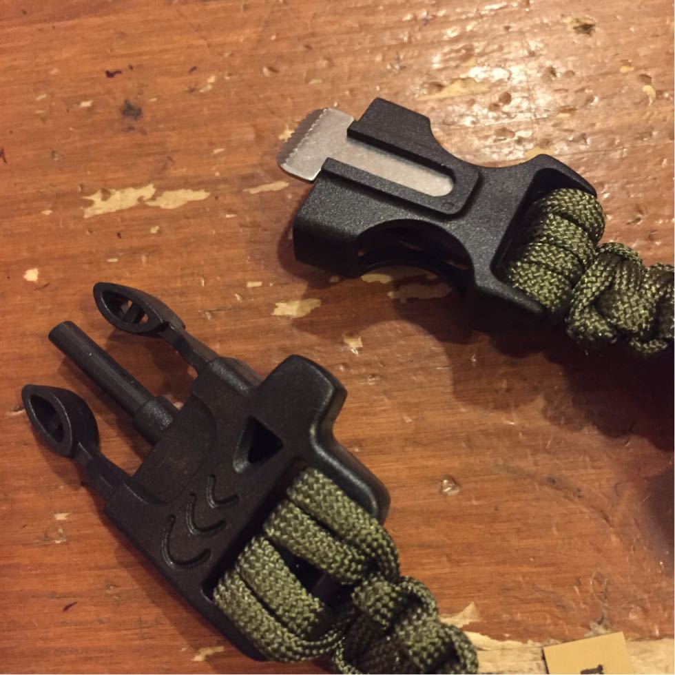 火起こしが出来るファイヤースターター、コンパス、ホイッスル、丈夫なパラシュートコードが装備された最強サバイバルブレスレットです。
